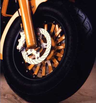 die TOLLE Gabel und das breite Vorderrad. Fender, Tank und Blecharbeiten wurden